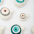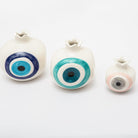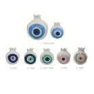 Χειροποίητα κεραμικά διακοσμητικά που παντρεύουν το σύμβολο του ματιού (για προστασία) με το ρόδι (για αφθονία και τύχη). Ζωγραφισμένα στο χέρι, σε ματ λευκό φόντο με λαμπερές λεπτομέρειες.
