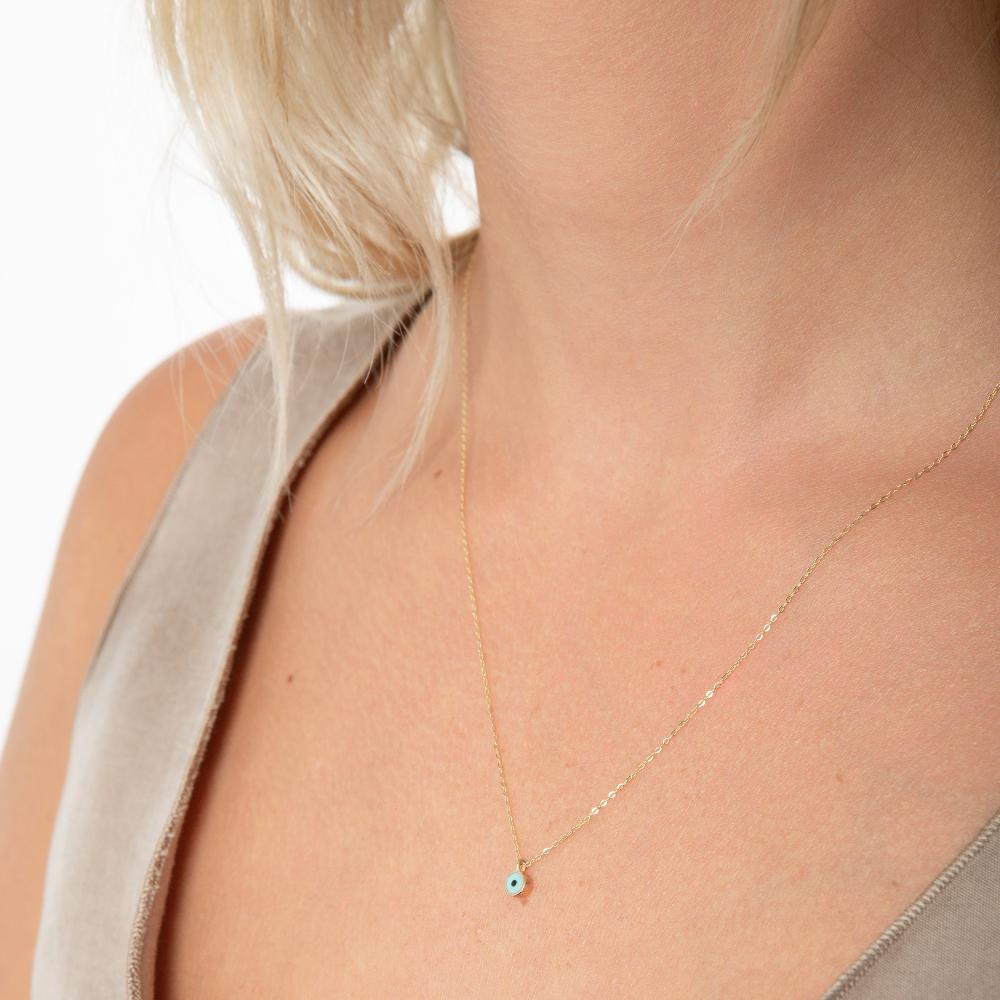 Λεπτό και γεμάτο νόημα, αυτό το κολιέ διαθέτει ένα κομψό μενταγιόν evil eye σε απαλό τιρκουάζ, που συμβολίζει την προστασία και την καλή τύχη. Ο μινιμαλιστικός σχεδιασμός και η λεπτή αλυσίδα από χρυσό επιτρέπουν στο μικρό αλλά εντυπωσιακό μενταγιόν του μάτιου να είναι το επίκεντρο, προσφέροντας τόσο κομψότητα όσο και συμβολισμό. Ιδανικό για καθημερινή χρήση ή για να συνδυαστεί με άλλα κομμάτια.