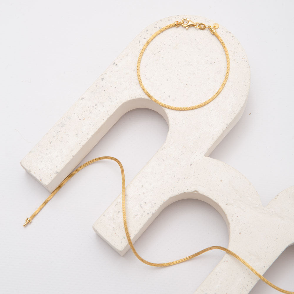 Αυτό το βραχιόλι ενσαρκώνει την αγνότητα και τη δύναμη της απλότητας. Η κομψή και ρευστή σχεδίαση σε συνδυασμό με λεπτές επιχρυσωμένες αλυσίδες που απλώνονται με χάρη στο δέρμα, προσφέροντας ένα λεπτό αλλά λαμπερό φινίρισμα. Ελαφρύ και κομψό, αποπνέει μια ήσυχη κομψότητα, καθιστώντας το ιδανικό για καθημερινή χρήση ή ειδικές περιστάσεις.