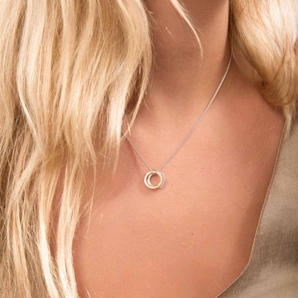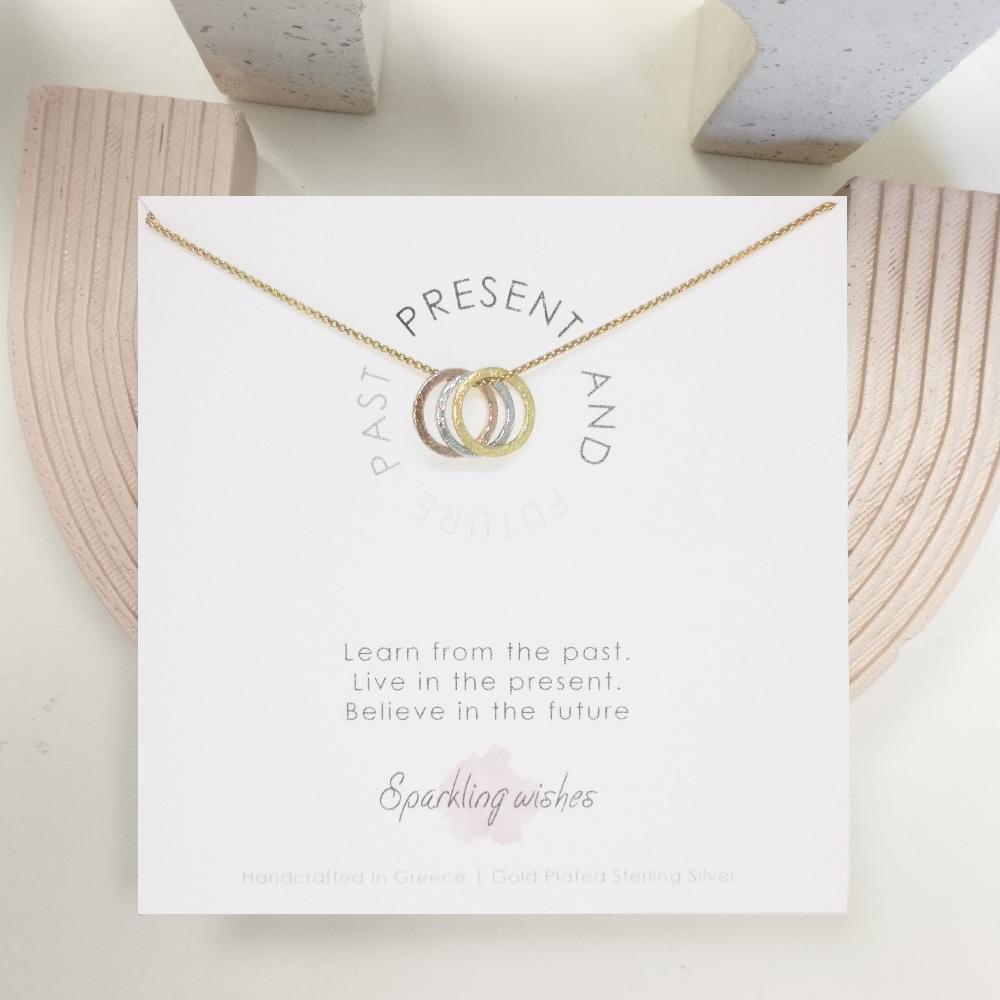 Αυτό το κομψό κολιέ διαθέτει μια λεπτή αλυσίδα διακοσμημένη με τρία πλεγμένα δαχτυλίδια, δημιουργώντας ένα μινιμαλιστικό αλλά εκλεπτυσμένο σχέδιο. Το τρίο των δαχτυλιδιών συμβολίζει το παρελθόν, το παρόν και το μέλλον προσφέροντας μια ουσιαστική υπενθύμιση για να αγαπάτε κάθε στιγμή.