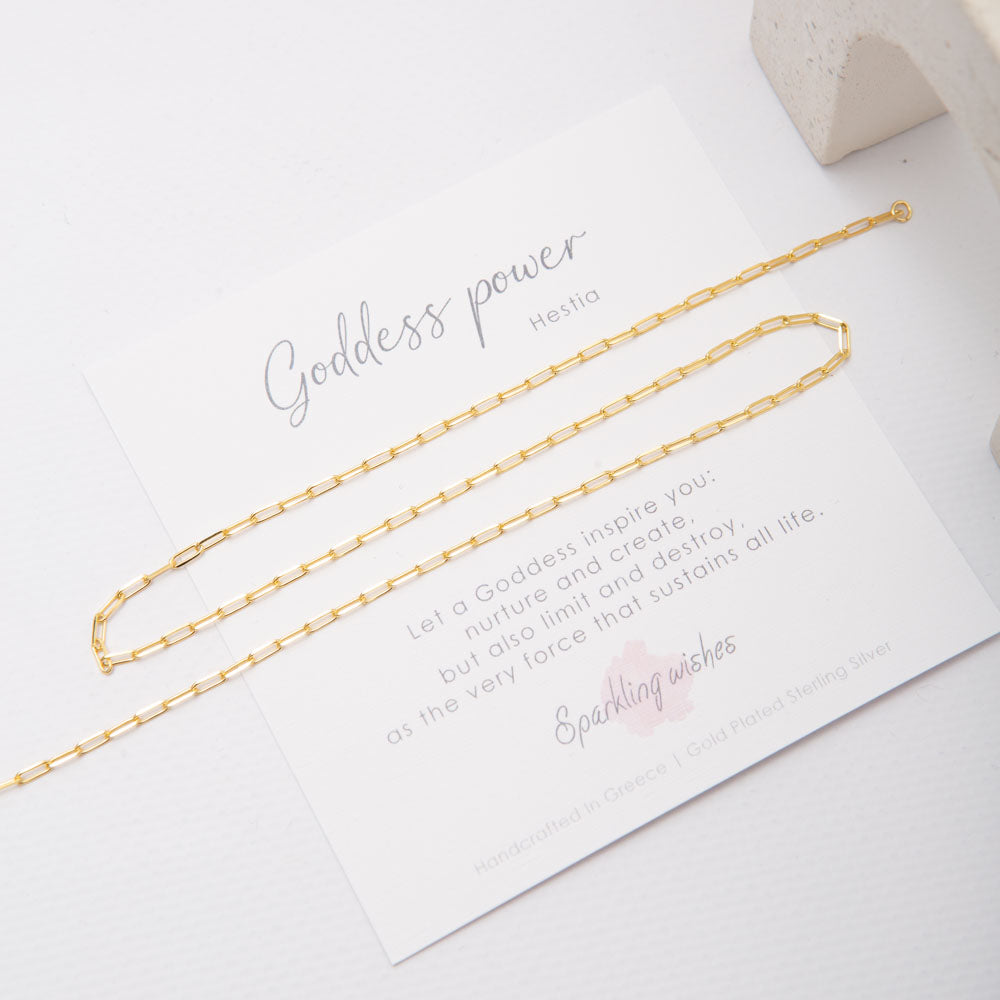 Ένα κομψό και ξεχωριστό κολιέ-αλυσίδα, σχεδιασμένο ως φόρος τιμής στη δύναμη, τη ζεστασιά και την εσωτερική γαλήνη της θεάς Εστίας. Με γυαλιστερό χρυσό φινίρισμα που αιχμαλωτίζει το φως και στιβαρό σχεδιασμό που εξασφαλίζει ανθεκτικότητα, το κολιέ Eστία συνδυάζει κομψότητα και δύναμη. Είναι η ιδανική επιλογή για όσους θέλουν να φορούν ένα κόσμημα που συμβολίζει τη ζεστή ενέργεια της εστίας, την προσωπική σύνδεση και την ήρεμη αυτοπεποίθηση.