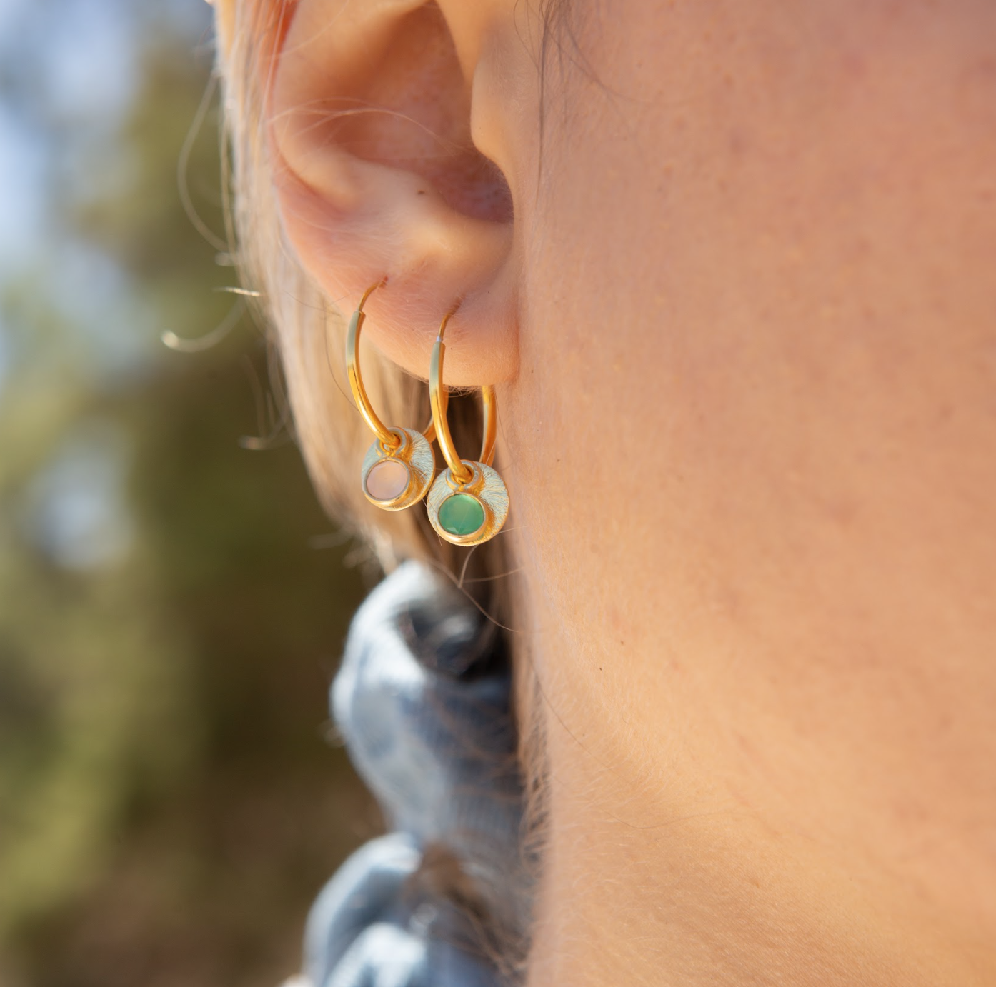 These radiant hoops feature a textured gold disc, and a sparkling gemstone drop — available in multiple stone colors to match your light.