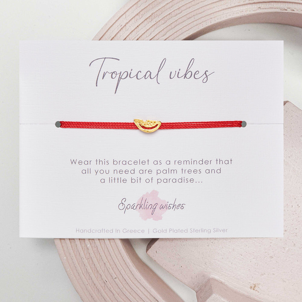 This playful bracelet features a golden watermelon slice charm, bringing a taste of summer to your everyday style. A cheerful reminder that paradise is never far away — it’s in the little moments of sunshine you carry with you.