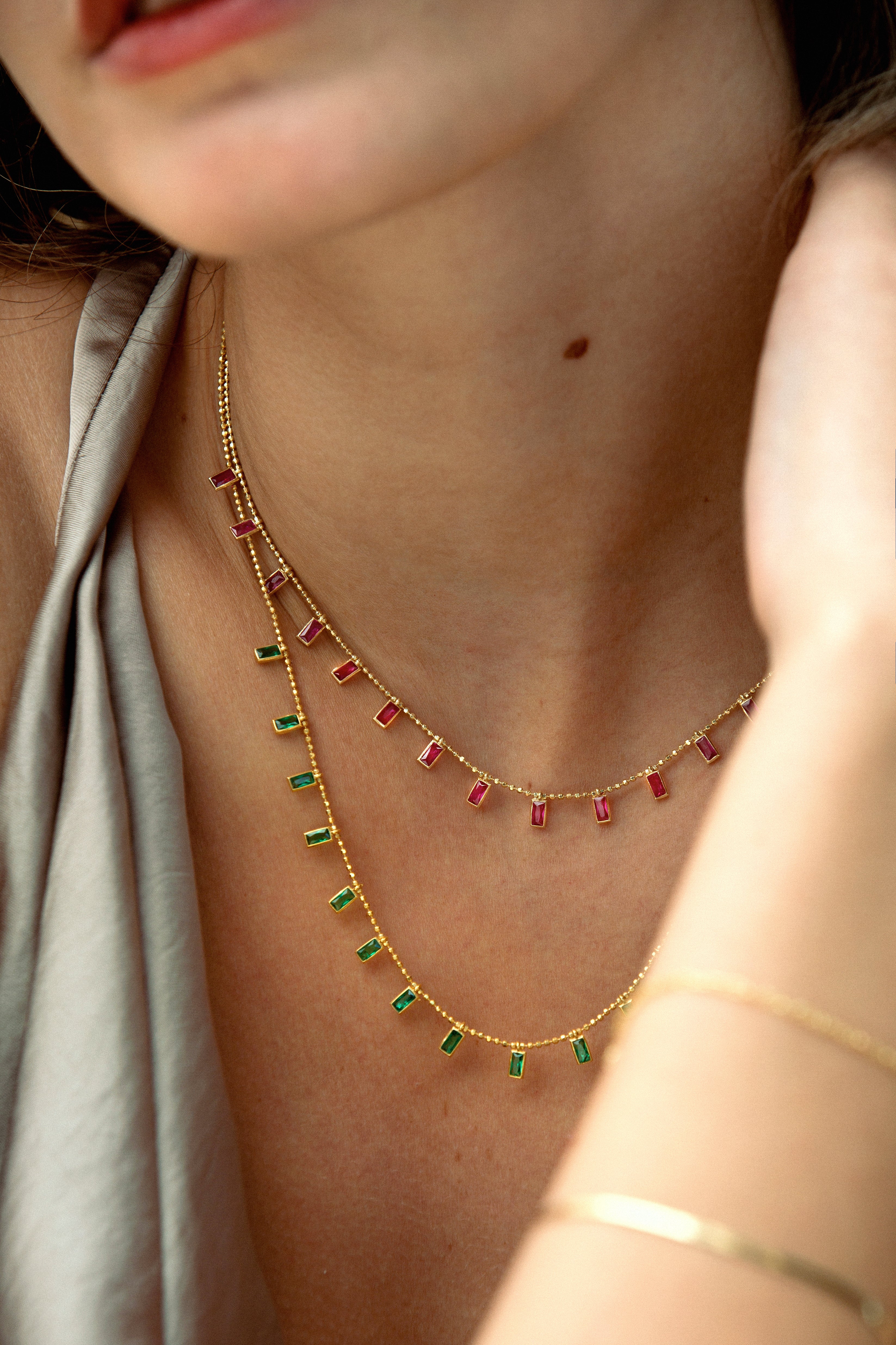 A delicate necklace adorned with fuchsia baguette charms forming a harmonious “heartline” around the neckline. Minimal, bright, and handcrafted in Greece, it carries a simple reminder: Be timeless.